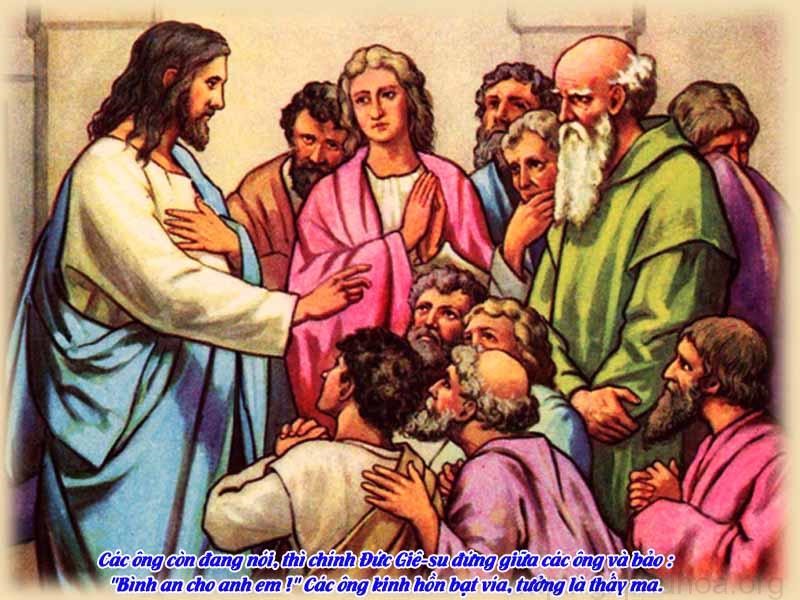 Hai môn đệ từ Emmau trở về, thuật lại cho Nhóm Mười Một và các bạn hữu những việc đã xảy ra dọc đường và mình đã nhận ra Chúa thế nào khi Người bẻ bánh. Các ông còn đang nói, thì chính Ðức Giêsu đứng giữa các ông và bảo: “Bình an cho anh em!” Các ông kinh hồn bạt vía, tưởng là thấy ma. Nhưng Người nói: “Sao anh em lại hoảng hốt? Sao còn ngờ vực trong lòng? Nhìn chân tay Thầy coi, chính Thầy đây mà! Cứ rờ xem, ma đâu có xương có thịt như anh em thấy Thầy có đây?” Nói xong, Người đưa tay chân ra cho các ông xem. Vì mừng quá, các ông vẫn chưa tin và còn đang ngỡ ngàng, thì Người hỏi: “Ở đây anh em có gì ăn không?” Các ông đưa cho Người một khúc cá nướng. Người cầm lấy và ăn trước mặt các ông. Rồi Người bảo: “Khi còn ở với anh em, Thầy đã từng nói với anh em rằng tất cả những gì sách Luật Môsê, các Sách Ngôn Sứ và các Thánh Vịnh đã chép về Thầy đều phải được ứng nghiệm.”