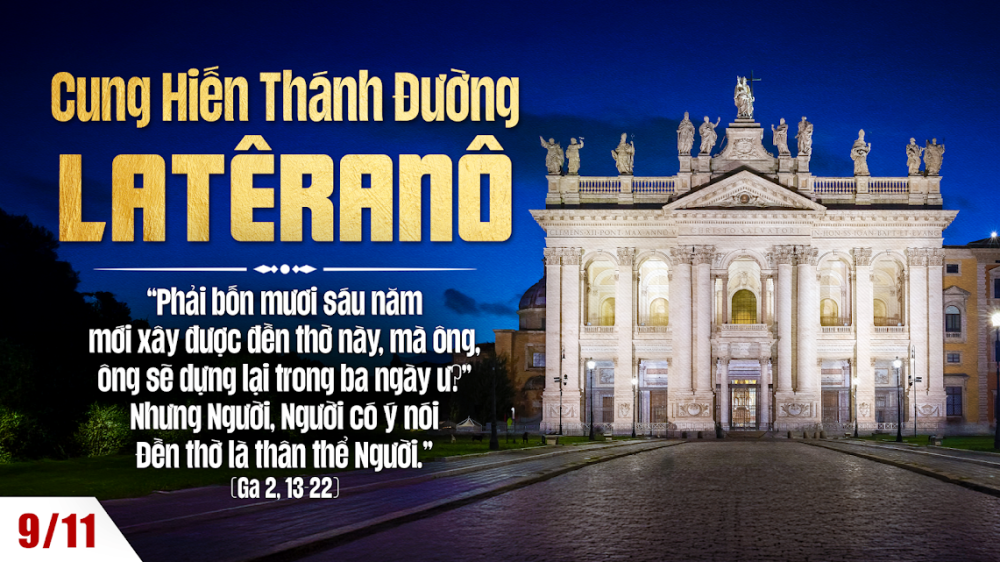 Và khi chúng ta biết để cho Chúa Giêsu thực sự ngự trị trong lòng mình, khi Người trở thành trung tâm của đời sống chúng ta, thì lúc ấy chúng ta không chỉ là đền thờ của Chúa, mà còn trở thành dấu chỉ cho người khác nhận ra sự hiện diện của Thiên Chúa trong thế giới hôm nay. Như vậy, việc mừng kính Cung hiến đền thờ Latêranô không chỉ là hướng đến một công trình tại Rôma, nhưng là cơ hội để tái dâng chính cuộc đời mình như một đền thờ thánh thiện, dâng lên Thiên Chúa, để Người thanh tẩy, thánh hóa và sử dụng theo ý Người. Và như thế, Giáo Hội không ngừng được xây dựng từ bên trong, nhờ vào những tâm hồn nhiệt thành và thánh thiện, những con người sống Lời Chúa mỗi ngày, và để cho Đức Kitô phục sinh làm chủ cuộc đời mình. Amen.