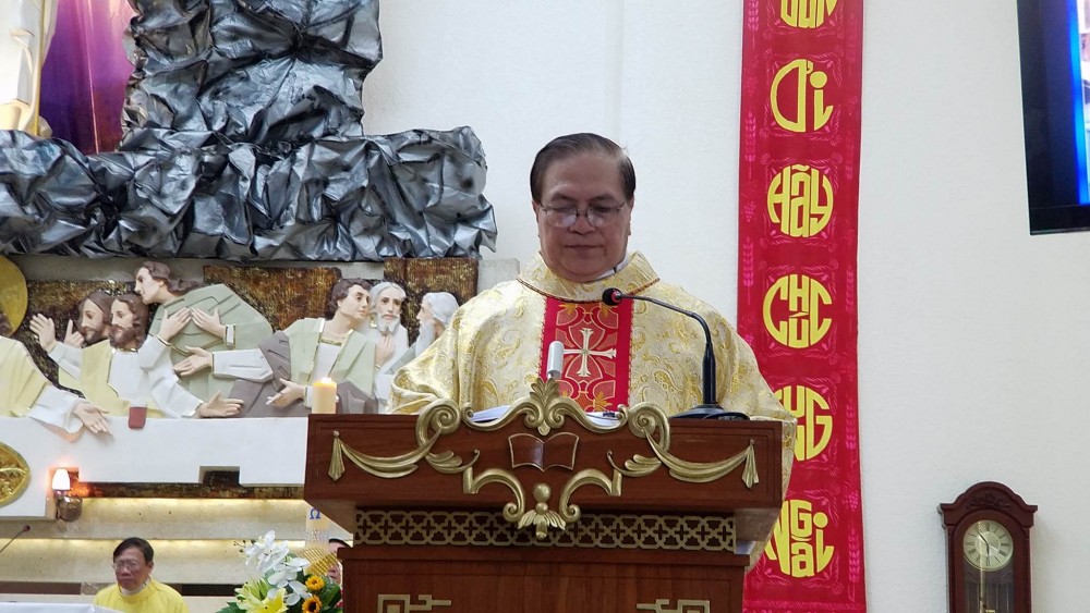Sau lời công bố Tin Mừng của Cha phó, Cha Đaminh ngỏ với cộng đoàn : “Chúng tôi chọn Tin Mừng Gioan để chúng ta cùng nhìn thấy Chúa là mục tử nhân lành. Mục tử nhân lành yêu thương, hy sinh mạng sống vì đoàn chiên. Người chăn thuê thì bỏ chiên và cho sói vồ lấy chiên …”