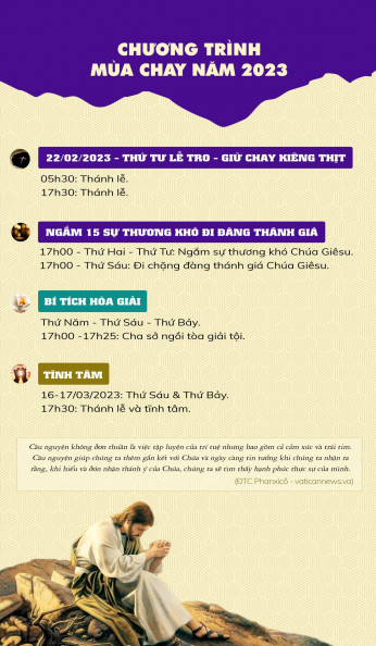 Kính gửi quý cộng đoàn chương trình phụng vụ mùa Chay và Tuần Thánh tại nhà thờ Phú Hòa, xin quý cộng đoàn theo dõi và sắp xếp công việc phù hợp với thời gian cùng tham dự :