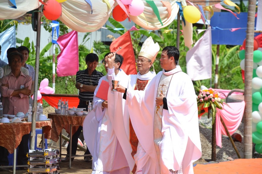 Sau bài giảng là nghi thức làm phép viên đá cũng như rảy nước Thánh phần diện tích xây dựng Nhà Thờ.