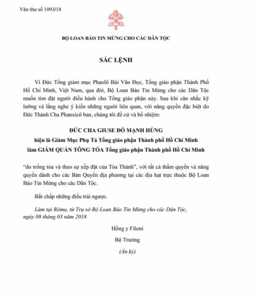 Ngày 8/3/2018 vừa qua, Đức cha Giuse Đỗ Mạnh Hùng đã được Toà Thánh, qua Bộ Loan Báo Tin Mừng cho các Dân Tộc, bổ nhiệm làm Giám quản Tông toà Tổng giáo phận Sàigòn – TP.HCM, để điều hành Tổng giáo phận trong lúc “trống toà” do sự ra đi đột ngột của Đức Tổng giám mục Phaolô Bùi Văn Đọc.