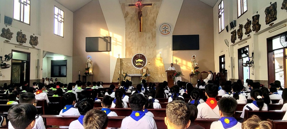 Vào lúc 7g30, tại Thánh đường Giáo xứ Phú Hòa, cha Martino Danh đã chủ sự Thánh lễ tạ ơn, hiệp ý cầu nguyện cho Giáo xứ được bình an và cách riêng cho các em thiếu nhi. Ngay từ đầu Thánh lễ, cha mời gọi cộng đoàn nâng tâm hồn lên cùng Chúa, gạt bỏ những bận tâm đời thường để mở lòng đón nhận ân sủng và sự thánh hóa của Thiên Chúa trong cử hành phụng vụ thánh.