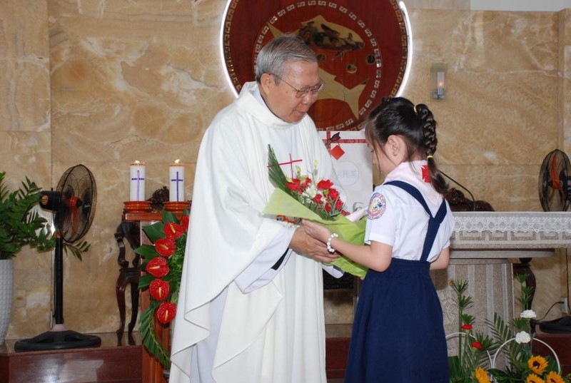 Nhân dịp mừng lễ bổn mạng TNTT ngài nhắc nhở các em hãy dâng lên Chúa lời cảm tạ hồng ân Chúa đã ban, vì các con là TN Thánh Thể nên phải siêng năng tham dự Thánh lễ và rước Mình Thánh Chúa. Hôm nay kỷ niệm 15 năm XĐ TNTT được thành lập 2000 – 2015. Trải qua 15 năm giáo xứ có sinh hoạt đoàn TNTT và cũng có nhiều bước thăng trầm nhưng đều vượt qua những gian nan thử thách. Có một số các anh chị huynh trưởng đã tham gia sinh hoạt trong những bước khởi đầu hình thành hiện nay không còn ở trong TNTT mà đã thâm nhập xã hội lập nghiệp cho cuộc sống riêng. Và vẫn còn các anh chị tiếp tục dấn thân ở lại để củng cố, chăm sóc những thế hệ kế tiếp và đây cũng là một tấm gương hy sinh để TNTT giáo xứ ngày càng thăng tiến. Cha khuyên các em trong sinh hoạt đoàn thể dù có gặp khó khăn hay thuận lợi cũng hãy cảm tạ hồng ân Chúa. Cha chúc mừng các em đã hoàn tất khóa học giáo lý 2014 – 2015 và khuyên các em luôn cố gắng sống ngoan ngoãn với mọi người, trong giáo xứ, ở gia đình.